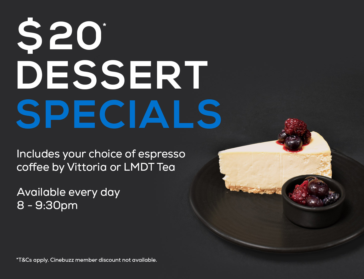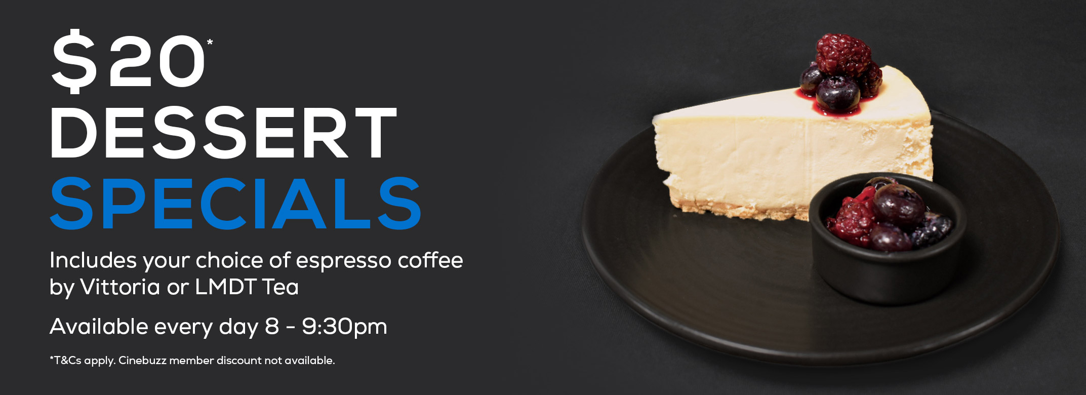 Each is served with your choice of either an espresso coffee by Vittoria or a LMDT Tea. Available from the IMAX Sydney bar between 8:00pm & 9:30pm every day.
