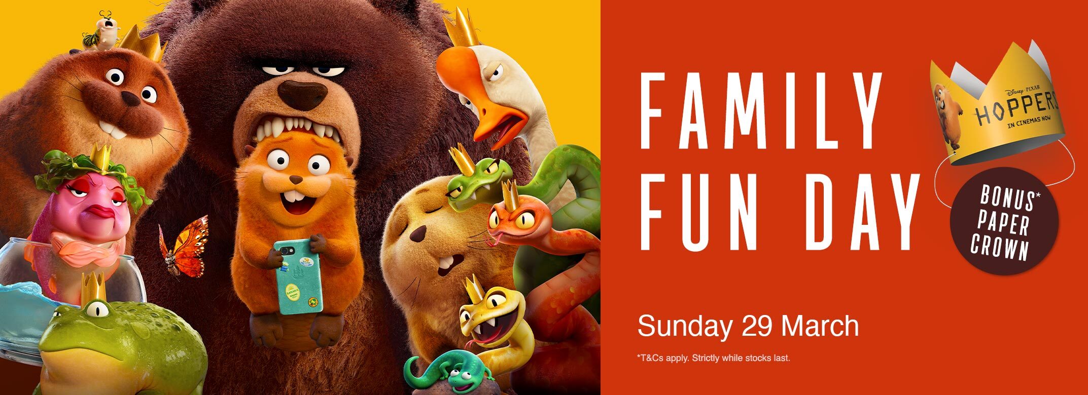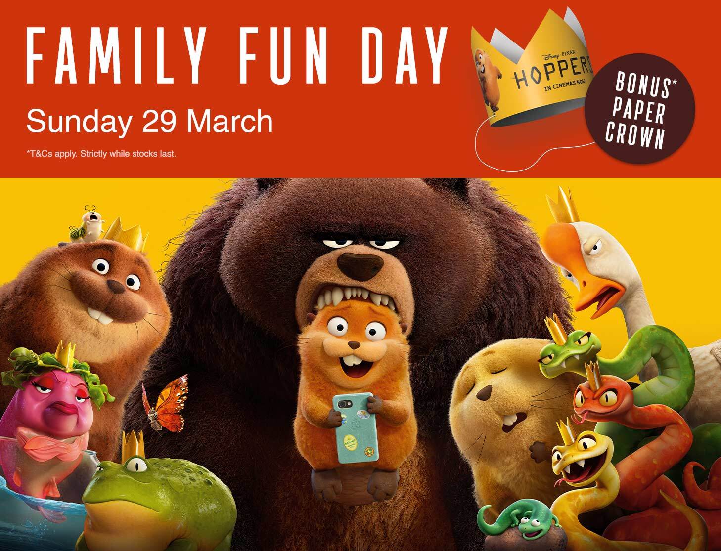*Online booking fees apply. Strictly while stocks last. Only valid for the Family Fun Day Screening of ‘HOPPERS’ on Sunday 29 March at 10:30am. Limited to one paper crown per child ticket only. Collection of paper crown must be on the day of screening and will be on a first served basis. Products may vary and change without notice.
