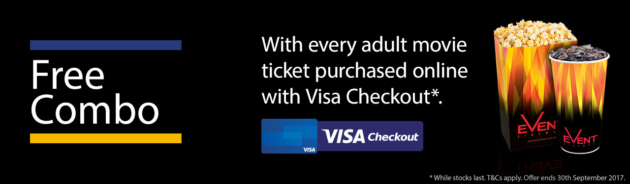 *Terms and Conditions: One free small popcorn and small drink per adult Visa Checkout ticket purchased online. Adult ticket must be paid for online using Visa Checkout to receive the free small combo. Offer is valid from 00:01 AEST Monday 21 August 2017 until 23:59 AEST 30 September 2017 or until stock runs out. Valid at Event Cinemas, Greater Union, GU Film House or BCC Cinemas. Surcharges apply for Vmax and 3D sessions. Not valid for Gold Class, Moonlight Cinema or Drive In. Not valid for special event screenings or in conjunction with any other offer. Redemption of small drink and small popcorn valid for session booked and cannot be exchanged or upgraded. $1.25 online booking fee applies
